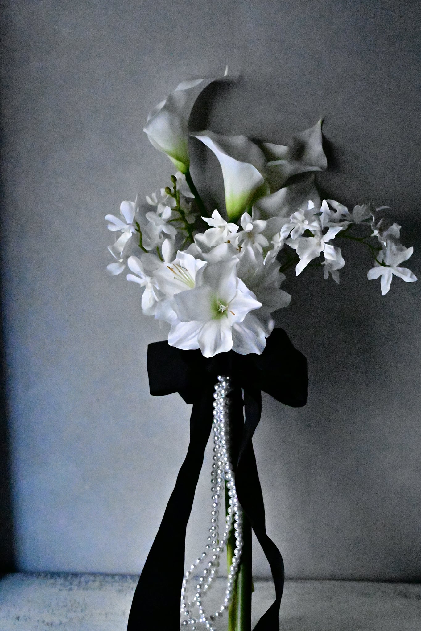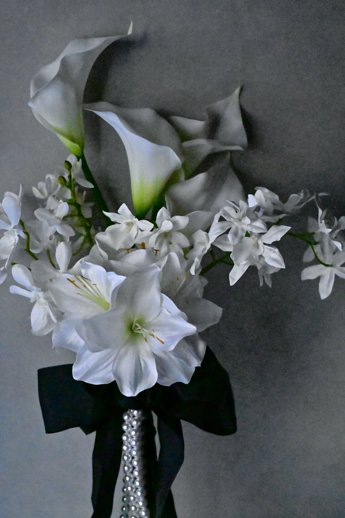 アマリリス、カラーリリー、オーキッドを束ねた、スタイリッシュでモダンなウェディングブーケ。